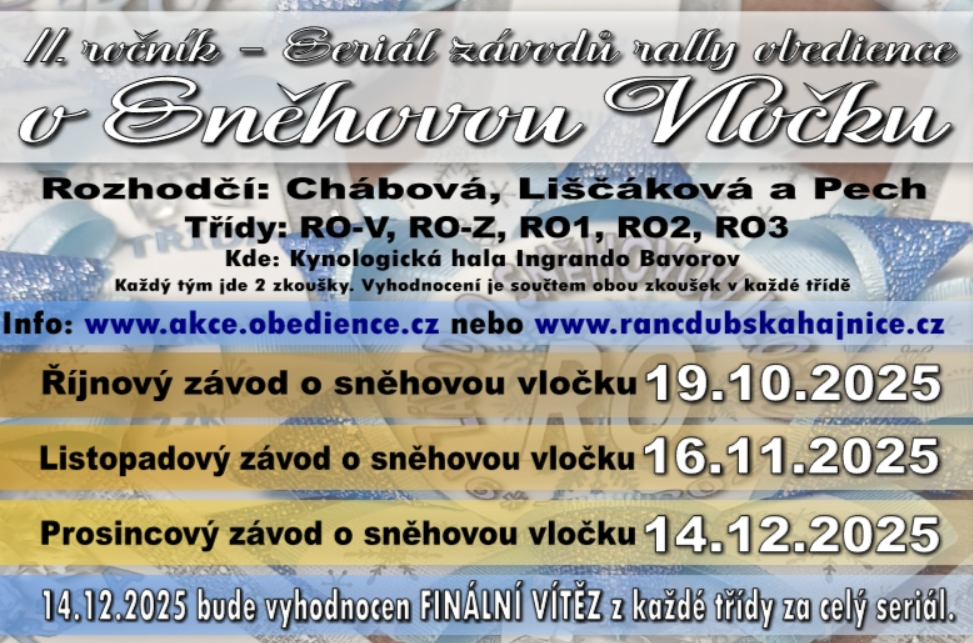 II. ročník závodů psů v Rally obedience se koná v Kynologické hale Ingrando v Bavorově. Akce probíhá ve třech termínech: 19.10., 16.11. a 14.12. 2025. Závodů se zúčastní více než 100 týmů, které předvedou práci se psy všech ras, včetně psů bez průkazu původu. Vstup je zdarma